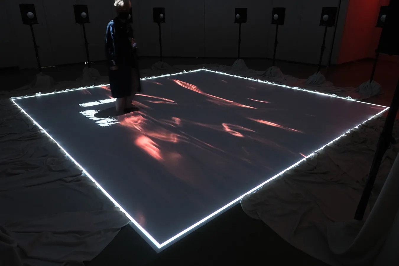 While other gallery pieces portray the narrative of the two characters in UNION, the installation invites audience members to become characters and interact with their surroundings by inhabiting the worlds of UNION. Collaborating with Aleksandar Zecevic, we filled the space with sound using a 16-channel speaker array. We built a speaker virtualization system that has the option to declare what type of 3D panning to encode to (VBAP, HOA) and how many speakers the system will decode to. Intel Realsense D435 and Isadora were used to develop a motion tracking system created by Sammy Chien. The tracking system sent xyz positions of audiences to the audio system via OSC, which generated sound objects and visualizations that moved based on the position of the participant in the 15x15ft floor projection. In consultation with ethnomusicologist Conner Singh Vanderbeek, we shaped a sound framework based on idioms of Guqin playing to create 3 movements in this experience: Earth (plucked sound), People (sliding sounds) and Heaven (harmonics). These idioms were cross-mapped onto the UNION worlds where Earth represents dystopia (where touch is forbidden), People represents the cyberworld (where everyone congregates), and Heaven represents the ritual union (wedding). The combination of acoustic and electronic instruments, recorded ambiences and sound effects created an immersive aural experience for each world, where participants experienced their individual and collective relationships through movement.